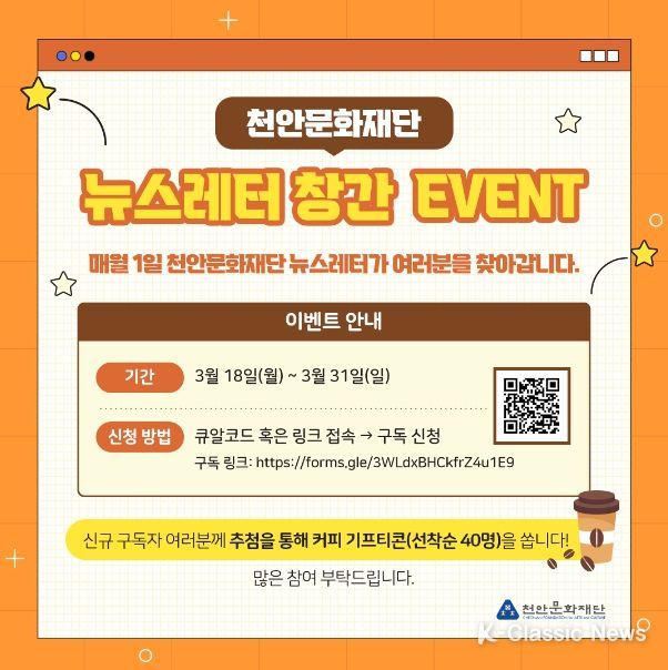 천안문화재단은 소식지 창간을 기념해 신규 구독자를 대상으로 이벤트를 진행하고 이벤트에 참여하는 선착순 40명에게 커피 기프티콘을 경품으로 제공할 예정이다.
