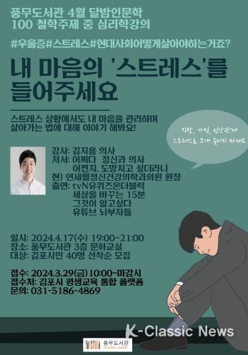 K-Classic News 기자 | 김포시 풍무도서관이 달밤 인문학 프로그램 ‘내 마음속 스트레스를 들어주세요’를 오는 4월 17일 수요일 오후 7시에 풍무도서관 문화교실에서 운영한다고 밝혔다. 풍무도서관의 달밤 인문학은 격월로 진행하며 이번 주제는 철학 주제의 심리학을 대상으로 한다.