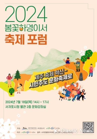K-Classic News 기자 | 서귀포시와 서귀포시문화도시센터는 오는 7월 18일,‘제주 축제 혁신 - 시민주도 문화축제로’라는 주제로 『2024 봄꽃하영이서 축제 포럼』을 서귀포시청 별관 2층 문화강좌실에서 개최한다.