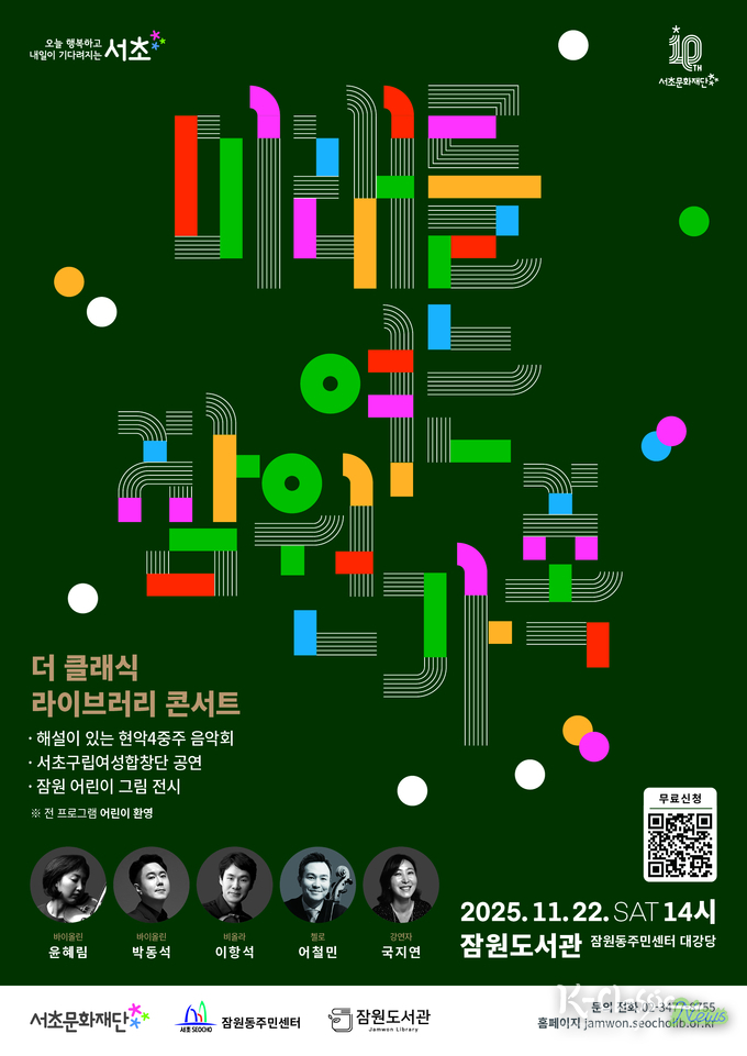 강은경 서초문화재단 대표이사는 “도서관에서 클래식 공연과 지역 참여 이벤트를 함께 운영함으로써 예술과 일상이 어우러지는 경험을 제공하고 도서관이 지역 문화예술의 거점으로 성장할 수 있도록 앞으로도 지원을 아끼지 않을 것”이라고 말했다.