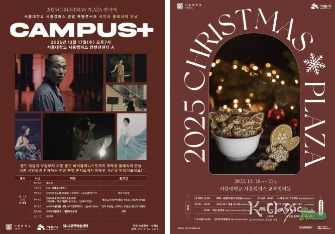 K-Classic News 기자 | 시흥시와 서울대학교 시흥캠퍼스가 오는 12월 17일부터 21일까지 특별 행사인 ‘2025 크리스마스 플라자(CHRISTMAS PLAZA)’를 개최한다. 올해 행사는 단 하루만 열리는 전야제 특별콘서트 ‘캠퍼스 플러스’를 중심으로, 국악과 클래식을 대표하는 최정상급 연주자들이 한자리에 모여 연말 분위기를 고조시킬 예정이다.