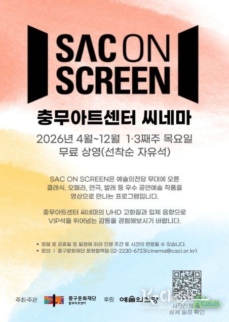 K-Classic News 기자 | 서울 중구문화재단은 예술의전당 공연 영상화 사업 ‘SAC ON SCREEN(싹 온 스크린)’에 선정돼 오는 4월부터 12월까지 연간 총 18회 규모의 상영회를 운영한다.
