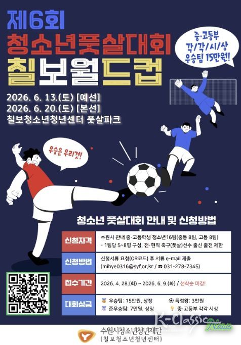 K-Classic News 기자 | 수원시청소년청년재단 칠보청소년청년센터는 오는 6월 13일(예선)과 20일(본선), 양일간 센터 내 풋살파크에서 녪. 청소년 풋살대회 [제6회 칠보월드컵]’을 개최한다고 밝혔다.