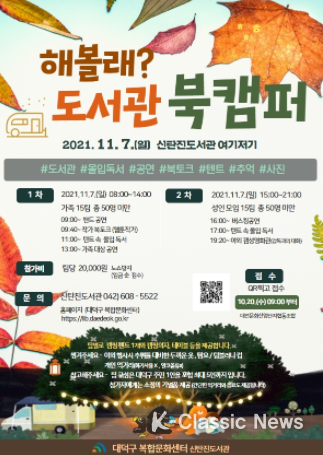 K-Classic News 조연정 기자 | 대전 대덕구 신탄진도서관에서는 오는 11월 캠핑과 독서, 문화공연이 어우러지는 ‘해볼래? 도서관 북캠퍼?’ 프로그램을 운영한다.