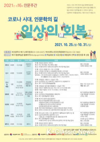 K-Classic News 조연정 기자 | 부산 북구는 제16회 인문주간을 맞아 10월 25일부터 30일까지 부산대학교 한국민족문화연구소와 함께 다양한 인문학 행사를 개최한다고 밝혔다.