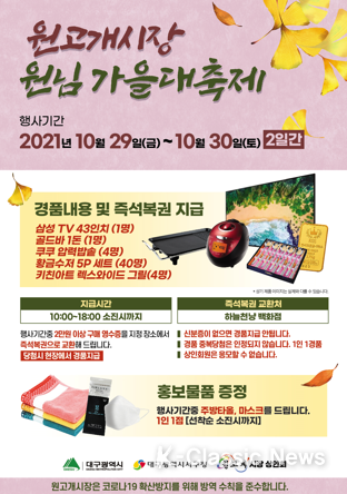 원님가을대축제는 29일과 30일 양일간 개최되며, 원고개시장을 방문한 이용 고객과 주민들에게 감사의 보답으로 2만원 이상 구매고객에게 즉석복권을 증정하여 TV, 황금 1돈을 비롯한 경품을 제공한다.