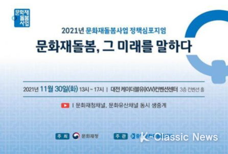 K-Classic News 최성수 기자 | 문화재청이 주최하고 중앙문화재돌봄센터에서 주관하는 ‘문화재돌봄사업 정책심포지엄’이 ‘문화재돌봄, 그 미래를 말하다’라는 주제로 오는 30일 오후 13시부터 대전 케이더블유(KW)컨벤션센터에서 개최된다.
