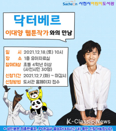 사천시어린이도서관이 오는 18일 오전 10시 공학박사이며 웹툰작가인 닥터베르 이대양 작가와 함께하는 ‘작가와의 만남’ 행사를 가진다.