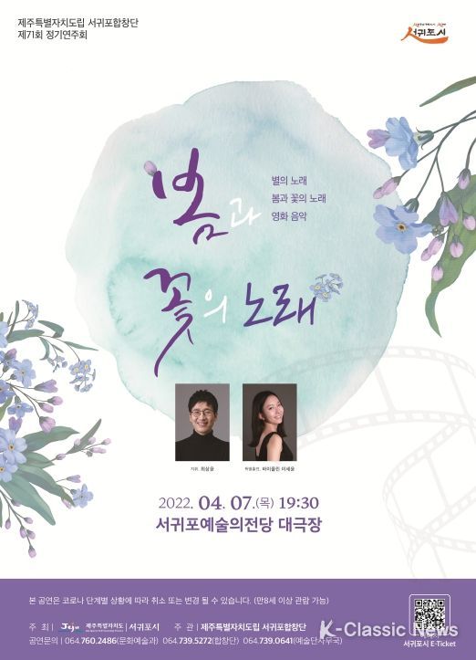 22년 첫 정기연주회를 여는 서귀포합창단은 '봄과 꽃의 노래'를 주제로‘별’,‘봄’,‘꽃’,‘영화 음악’을 메인 테마로 삼아 따뜻한 봄의 합창을 통해 관객들을 맞이한다.