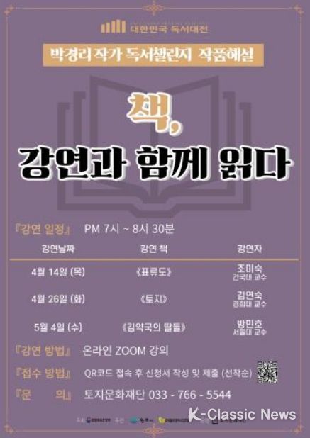 강연은 오는 4월 14일, 4월 26일, 5월 4일 오후 7시에 진행되며, 이후에도 9월까지 박경리 작가의 작품 해설 강연이 열릴 예정이다.