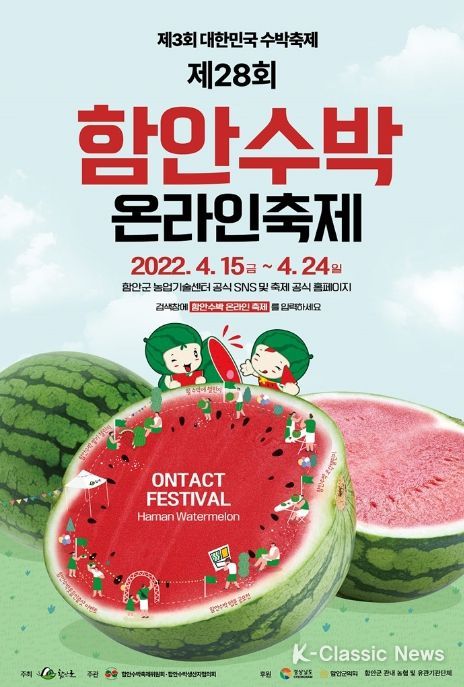 K-Classic News 최성수 기자 | 함안군은 오는 15일부터 5월 8일까지 ‘제3회 대한민국 수박축제 및 제28회 함안수박 온라인 축제’를 개최하고, 온라인 행사와 소비자 판촉 행사를 함께 추진한다고 밝혔다.