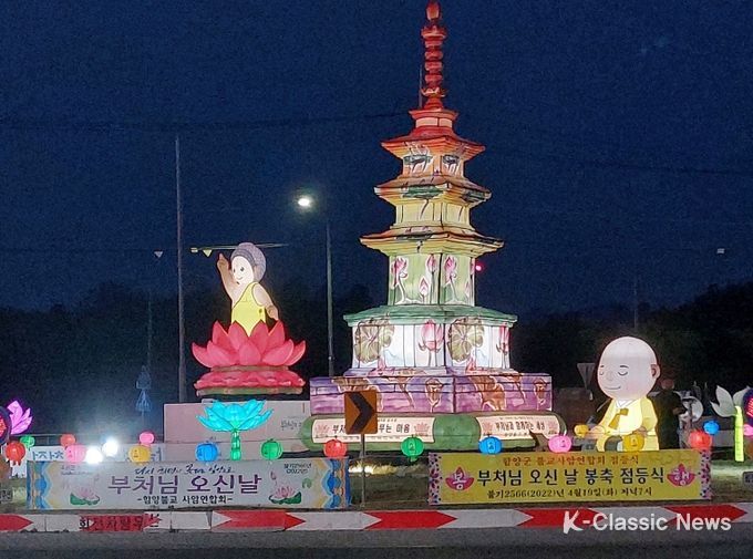 K-Classic News 최성수 기자 | 함양불교사암연합회는 4월 19일 오후 7시 불기 2566년 부처님 오신 날을 맞아 함양 시외버스터미널 로터리에서 봉축 점등 행사를 개최했다.