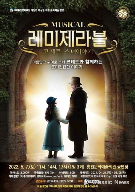 K-Classic News 최성수 기자 | (재)홍천문화재단은 가정의 달을 맞아 오는 5월 7일 토요일 오전 11시, 오후 2시, 오후 5시에 홍천문화예술회관 공연장에서 온 가족이 함께 볼 수 있는 명작 가족 뮤지컬‘레미제라블-코제트 소녀이야기’를 개최한다고 밝혔다.