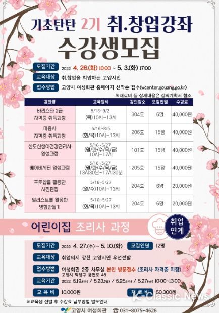 K-Classic News 최태문 기자 | 고양시 여성회관이 고양시민의 취업준비를 지원하기 위한 취․창업 강좌를 개설하고 수강생을 모집한다. 교육 신청은 4월 26일부터 여성회관 홈페이지에서 선착순으로 접수할 수 있다.