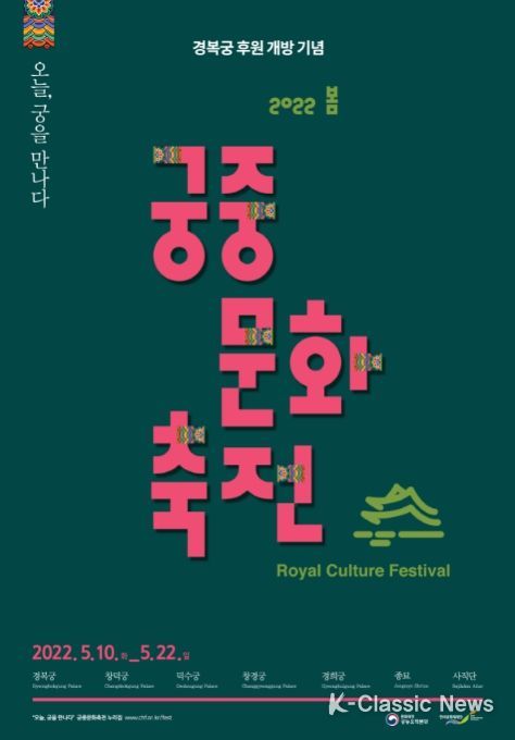 K-Classic News 최성수 기자 | 문화재청 궁능유적본부와 한국문화재재단은 '2022 봄 궁중문화축전'을 오는 5월 10일부터 22일까지 5대궁(경복궁·창덕궁·덕수궁·창경궁·경희궁)과 종묘·사직단 일대에서 13일간 개최한다. 특히, 올해 궁중문화축전은 경복궁 후원 개방을 기념하여 행사 범위가 확대되었다.