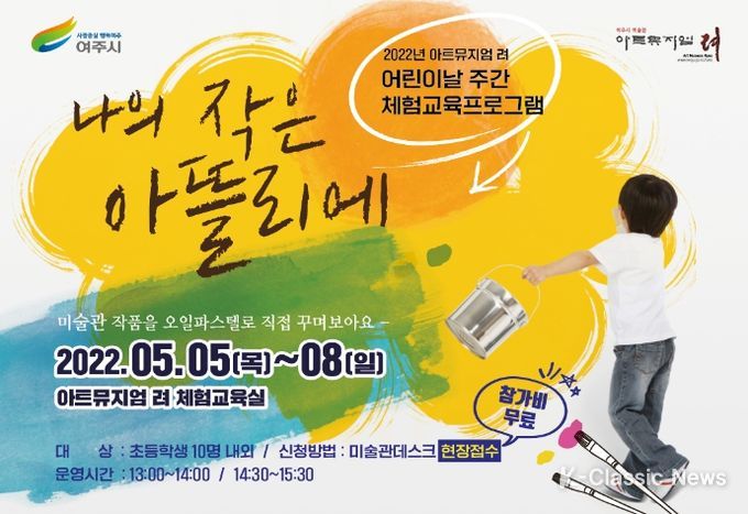 K-Classic News 최성수 기자 | 여주시 미술관 '아트뮤지엄 려'는 정부의 코로나19 방역지침 완화와 다가오는 어린이날 주간(5~8일)을 맞이하여 체험교육프로그램을 운영한다.
