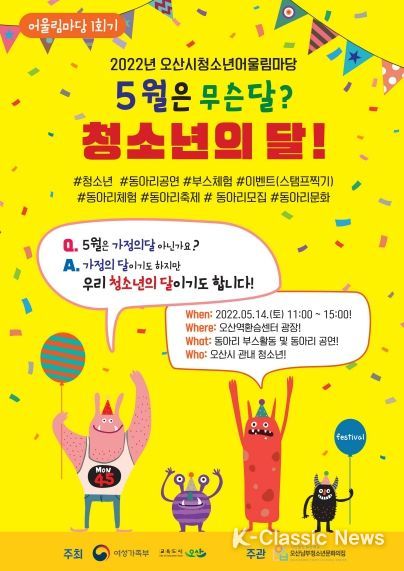 K-Classic News 최태문 기자 | 여성가족부와 오산시에서 주최하고 오산남부청소년문화의집에서 주관하는 2022년 오산시청소년 어울림마당 1회기 행사가 5월 14일 토요일 오산역환승센터광장에서 진행될 예정이다.