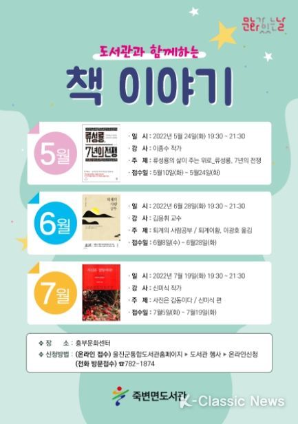 K-Classic News 최태문 기자 | 울진군 죽변면도서관은 문화가 있는 날을 맞이하여 5월에서 7월까지 다양한 주제로 인문학 강연을 진행한다.