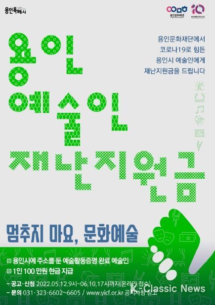K-Classic News 최태문 기자 | (재)용인문화재단은 코로나19 사태 장기화로 경제적 어려움을 겪은 용인 예술인을 대상으로 '2022 용인 예술인 재난지원금' 사업을 시작한다. 오는 12일부터 내달 10일까지 신청을 받으며, 6월 중 지원금을 지급할 예정이다.