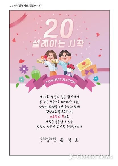 K-Classic News 정명선 기자 | 청도군은 5월 16일 제50회 성년의 날을 맞아 만19세가 된 2003년생 300여명에게 축하 카드를 발송한다고 밝혔다.