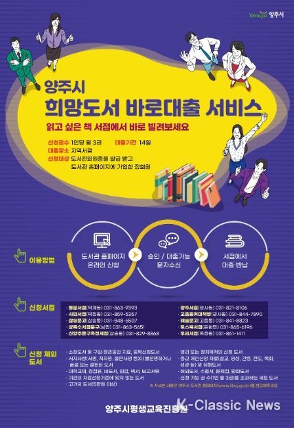 K-Classic News 최태문 기자 | 양주시는 독서 이용 편의 향상을 위해 오는 16일부터 ‘지역서점 희망도서 바로대출’ 서비스를 운영한다.