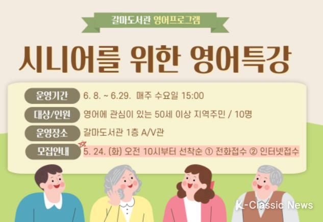 K-Classic News 정명선 기자 | 대전 서구 갈마도서관에서는 50세 이상 지역주민들을 대상으로 ‘시니어를 위한 영어 특강’을 운영한다고 22일 밝혔다.