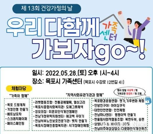 K-Classic News 정명선 기자 | 목포시가족센터가 오는 28일 오후 1시 제13회 건강가정의 날 가족축제인 ‘우리 다함께 가보자 go~!’를 개최한다.