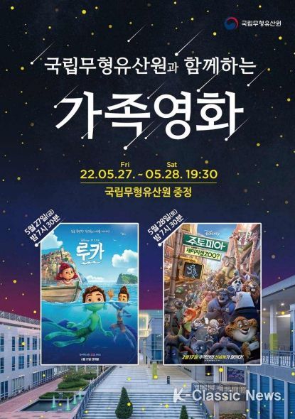 K-Classic News 최성수 기자 | 문화재청 국립무형유산원은 5월 27일부터 28일까지 오후 7시 30분부터 국립무형유산원 야외 마당(전북 전주시 소재)에서 가족영화를 무료로 상영한다.