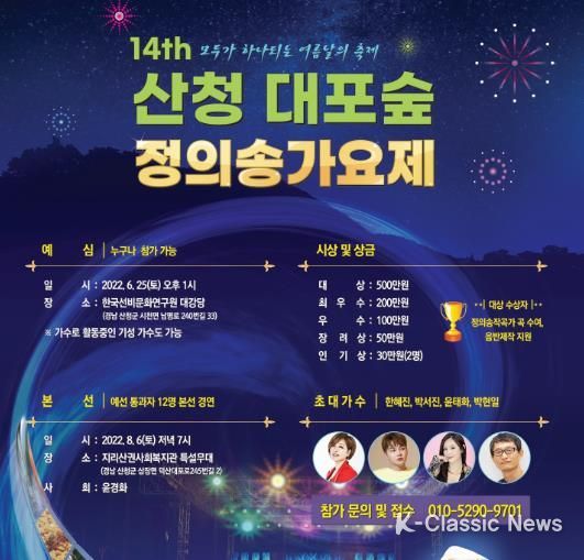 K-Classic News 정명선 기자 | 산청군은 오는 8월6일 오후7시 산청군 삼장면에서 열리는 ‘제14회 산청 대포숲 정의송 가요제’의 참가신청이 잇따르고 있다고 2일 밝혔다.