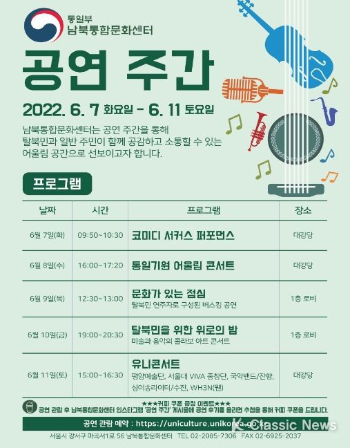 K-Classic News 최성수 기자 | 통일부 남북통합문화센터는 누구나 쉽게 남북통합문화를 즐기기 위해 6월 7일(화)부터 6월 11일(토)까지'6월 공연주간'을 개최한다.