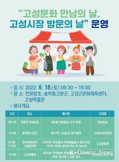K-Classic News 정명선 기자 | 고성군은 6월 18일, 지역경제 활성화와 지역민의 문화복지를 위한 ‘고성문화 만남의 날, 고성시장 방문의 날’을 운영한다.