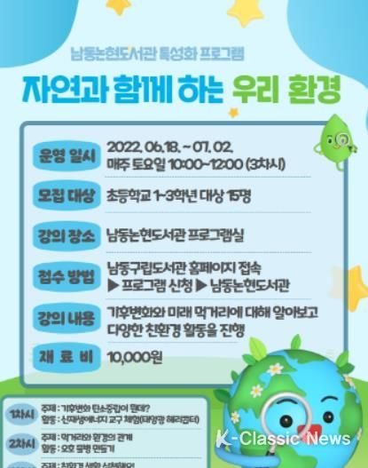 6월 18일 시작하는 ‘자연과 함께하는 우리 환경’은 남동논현도서관 프로그램실에서 진행하며, 남동구립도서관 홈페이지를 통해 신청할 수 있다.