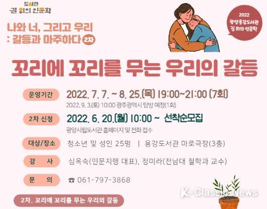 K-Classic News 정명선 기자 | 광양용강도서관이 ‘나와 너, 그리고 우리: 갈등과 마주하다’라는 큰 주제로 심리와 사회·철학 방면으로 나눠 운영하는 ‘길 위의 인문학’의 2차 프로그램 수강생을 모집한다.