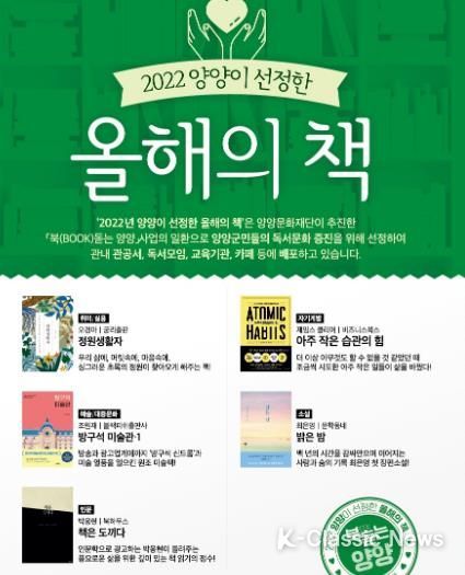 K-Classic News 정명선 기자 | (재)양양문화재단은 ‘2022 북(BOOK) 돋는 양양’ 사업의 일환으로 양양군민들의 독서문화 환경 조성을 위해 도서 5권을 선정하여 관내 관공서, 독서모임, 교육기관 등에 배포하는 ‘2022년 양양이 선정한 올해의 책’ 사업을 추진한다.