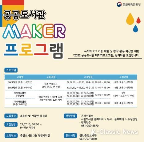 K-Classic News 정명선 기자 | 광양중앙도서관이 문화체육관광부에서 주최한 ‘2022 공공도서관 메이커프로그램 운영 지원사업’ 수행기관으로 선정돼 오는 30일부터 여름방학 메이커프로그램을 운영한다.