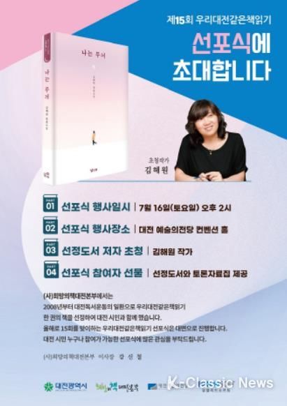 K-Classic News 정명선 기자 | 대전시는 올해 시민과 함께 읽을 한 권의 책으로 김해원 작가의 '나는 무늬'를 선정하고, 오는 16일 오후 2시 대전예술의전당에서 2022년 우리대전 같은책 읽기 운동의 시작을 알리는 선포식을 개최할 예정이다.