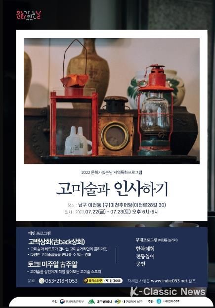 오는 7월 22일과 23일에는 이천동 고미술거리에서 '문화가 있는 날 고미술과 인사하기' 프로그램과 신천둔치에서 '문화가 숨쉬는 남구! 야외상설공연'이 동시에 개최되어 문화공연을 즐기려는 시민들의 볼거리가 더욱 풍성해질 것으로 기대된다.