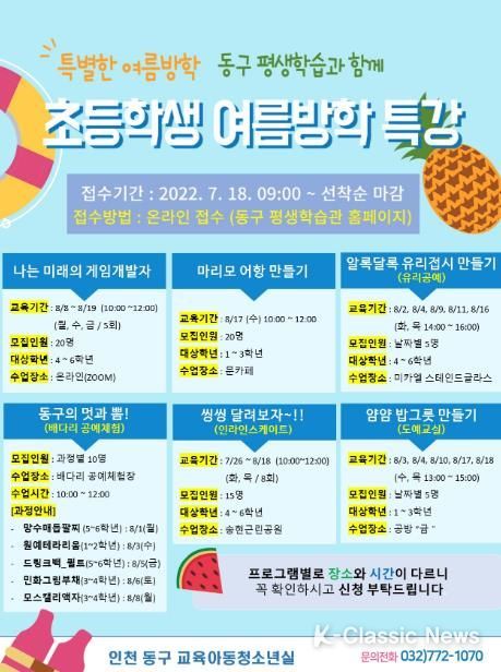 K-Classic News 정명선 기자 | 인천 동구은 여름방학을 맞아 관내 초등학생을 위해 다양한 체험 프로그램을 구성해 7월 26일부터 8월 19일까지 운영한다.