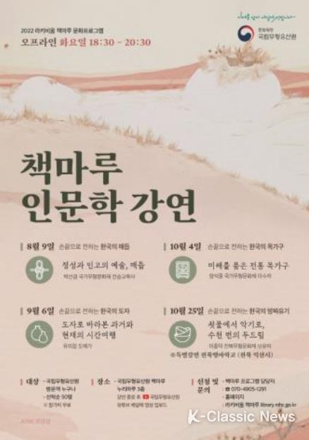 K-Classic News 최성수 기자 | 문화재청 국립무형유산원은 '책마루 인문학 강연' 하반기 문화프로그램을 오는 8월 9일부터 10월 25일까지 대면 강연 3회와 특별강연 1회로 총 4회 진행한다.