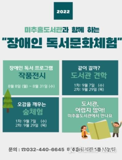 특히 이번 프로그램에서는 2022년 상반기 장애인 독서프로그램에 참여한 장애인들의 작품을 8월 한 달간 미추홀도서관에 전시하고, 9월에는 도서관 방문이 어려운 장애인들에게 도서관 이용 안내, 남동구청 공원녹지과와 협업을 통한 '오감을 깨우는 숲 체험'을 진행할 예정이다.