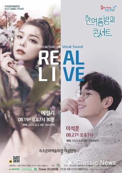 K-Classic News 정명선 기자 | 속초시는 8월 19일 금요일 오후 7시 30분, 8월 27일 토요일 오후 7시, 2주에 걸쳐 속초문화예술회관 대공연장에서 2022년 맞춤형 기획공연으로‘REAL LIVE"한여름밤의 콘서트"’를 개최한다.