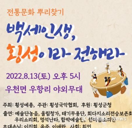 K-Classic News 정명선 기자 | 횡성예총이 주최하고, 횡성국악협회 주관, 횡성군이 후원하는 "백세인생, 횡성이라 전해라" 공연이 2022년 8월 13일 토요일 오후 5시 우천의 야외무대(우천면 우항3길 1, 우천노외주차장 무대)에서 무료공연으로 펼쳐진다.
