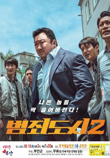 K-Classic News 김성연 기자 | 부안군은 부안예술회관 공연장에서 오는 8월 18일 오후 3시와 오후 7시 30분 하루 2회에 걸쳐 영화 ‘범죄도시2’를 무료로 상영한다.