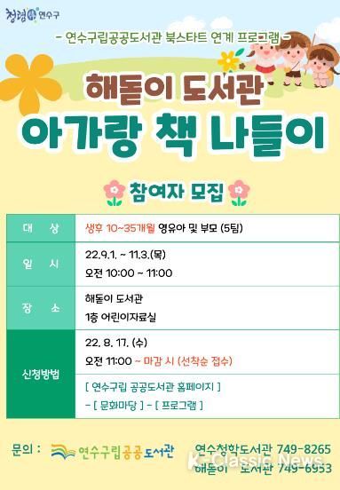 생후 3~35개월 영·유아 자녀와 부모라면 누구나 참여 가능하며, 8월 17일부터 연수구립공공도서관 홈페이지를 통해 신청을 받고 있다.