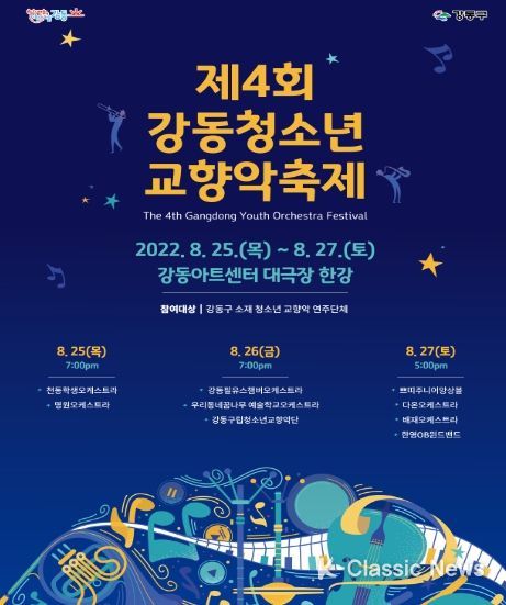 K-Classic News 진금하 기자 | 클래식 꿈나무들의 수준 높은 공연이 펼쳐지는 ‘강동청소년교향악 축제’가 8월 25일부터 27일까지 사흘간, 강동아트센터 대극장 한강에서 개최된다.