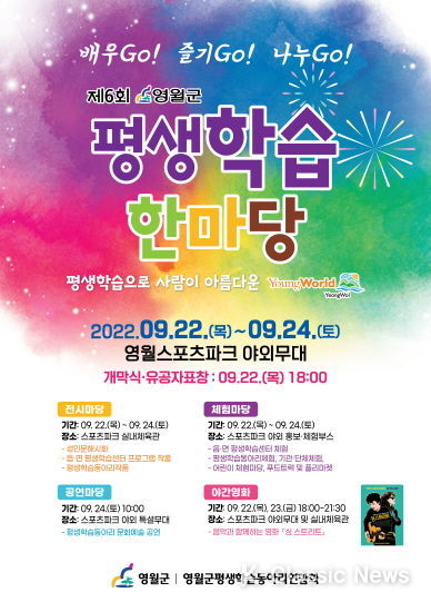 K-Classic News 강희현 기자 | 제6회 영월군 평생학습 축제 행사가 영월스포츠파크 야외무대 및 실내체육관에서 오는 9월 22일부터 24일까지 3일간 펼쳐지며 평생학습 관련 기관단체 홍보체험부스, 작품전시, 평생학습동아리 공연마당, 야간 영화상영 등 다채롭게 진행된다.