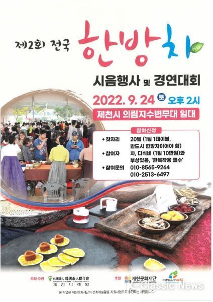 K-Classic News 강희현 기자 | 제천다례원은 제2회 전국 한방차 시음행사 및 경연대회를 오는 9월 24일 오후2시 의림지 수변무대에서 개최한다.