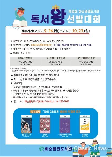 K-Classic News 강희현 기자 | 화순군이 군민의 건전한 독서문화 정착을 위해 ‘제12회 화순열린도서관 독서왕 선발대회’를 연다.