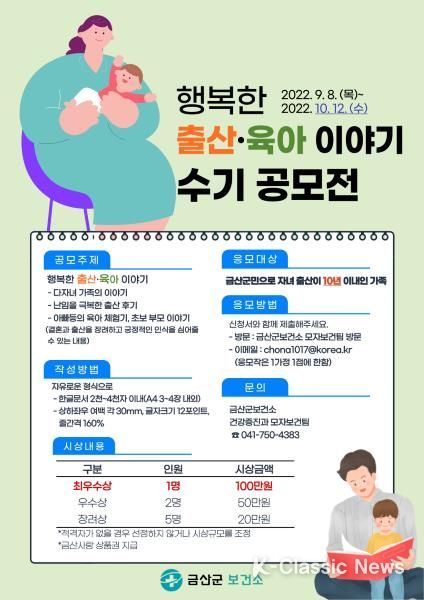 K-Classic News 강희현 기자 | 금산군은 저출산 극복을 위해 추진하고 있는 행복한 출산·육아 수기 공모 자격을 기존 자녀 출산 5년 이내 가족에서 10년으로 확대했다.