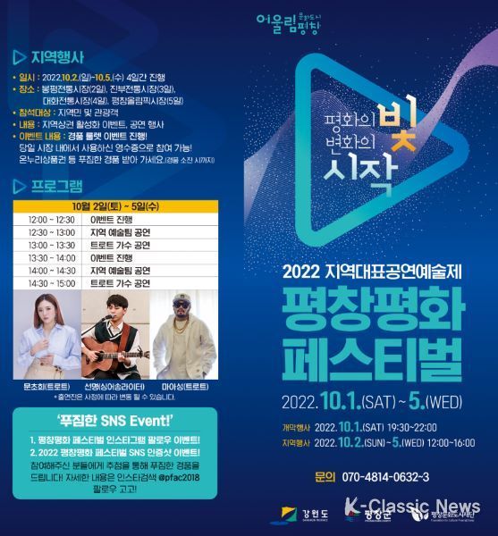 K-Classic News 강희현 기자 | 평창군과 평창문화도시재단은 오는 10월 1일 ‘2018 평창동계올림픽 및 동계패럴림픽 대회 기념관’ 야외무대에서 ‘2022 평창 평화페스티벌’을 개최한다.